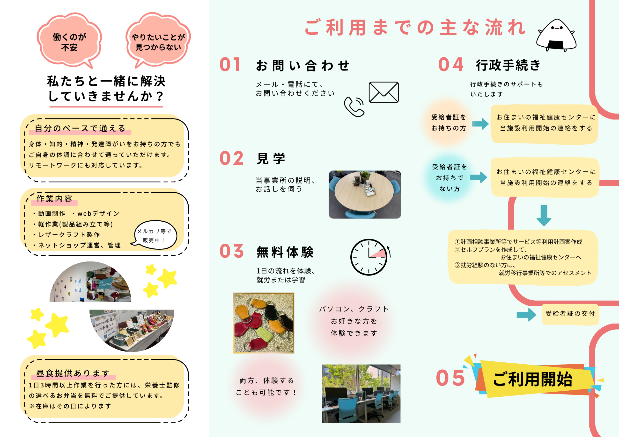 商品化を目指すレザー製品の作成とその販売サイトの立ち上げ、 ステッカーのカットとその注文受付サイトの立ち上げ。 静止画・動画コンテンツの制作とその配布サイトの立ち上げ、と。 手作業からITまで、スタッフ全員で勉強中です! 一緒に勉強して腕を磨きませんか?