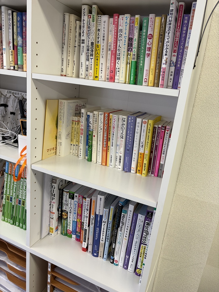 本棚は大きく分けて左右2列に分かれており、まずは右側の1列をご紹介します。こちらの棚には心理学系の本であったり、自己啓発本が多くを占めています。最下段には資格本やPCのソフトウェアに関する本などを置いています。