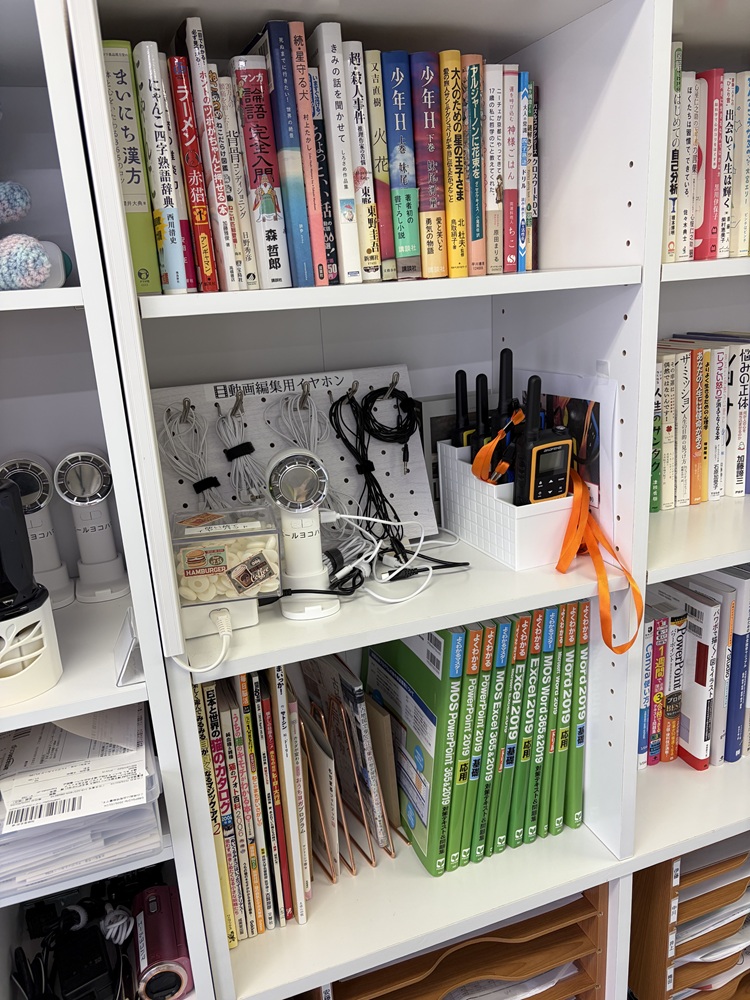次に、左側の列の本棚を見ていきましょう。こちらの棚は、上部には主に小説類が、中段には動画編集用イヤホン、施設外就労の際に使用していたトランシーバーやハンディ冷却ファンなど様々な小道具が置いてあります。そして、最下段にはMOS資格のWord、Excel、PowerPointの資格本が主に並んでいます。