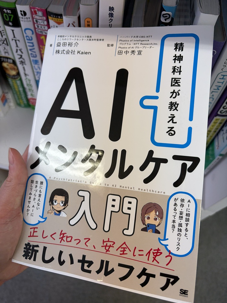 こちら(以下写真)はAIメンタルケアという、今、YouTubeで話題の益田裕介先生と就労移行支援事業所のKaien様が共著の本です。こちらの書籍は、ChatGPTなどのAIツールを使用して心のケアを行っていくことを勧めた書籍です。最近では、AIを悩みなどの相談相手に使用することが当たり前になってきている中、そうはいっても使い方がわからない。そんな時にこちらの本を手に取ってみてはいかがでしょうか。