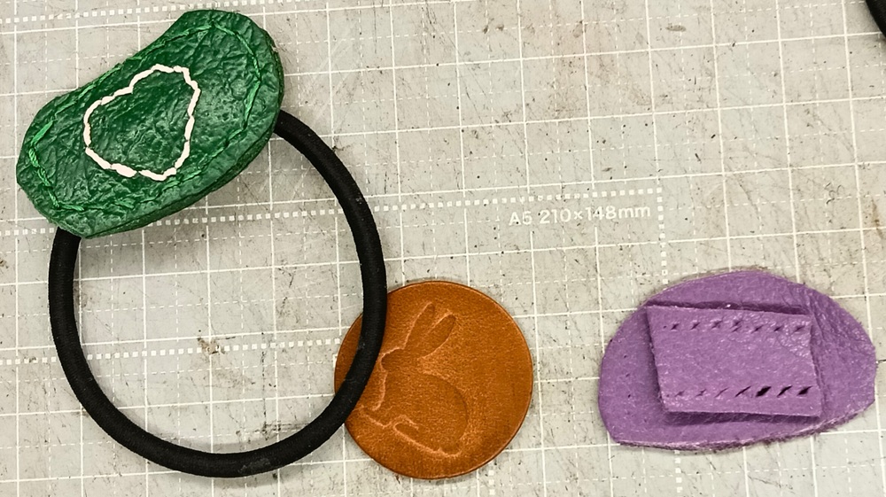 - 革細工の髪留め製作中